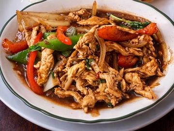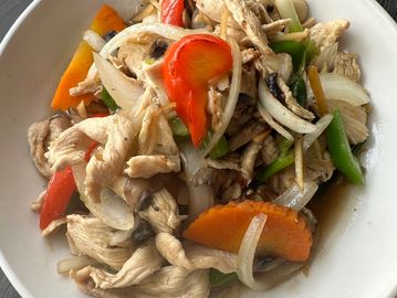 Stir-fried shredded ginger, onion, bell pepper, carrot, and mushrooms.