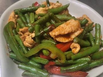 Stir-fried crispy pork belly slices, Chinese broccoli, and garlic with oyster sauce.