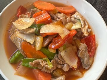 Stir-fried onion, bell pepper, snow peas, carrots, pineapple, and tomato.