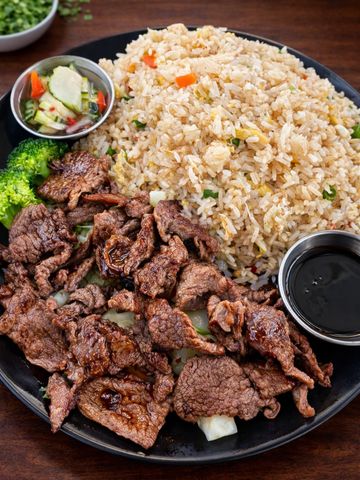 Frilled meat with house teriyaki sauce and steamed vegetables.