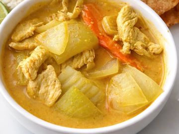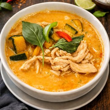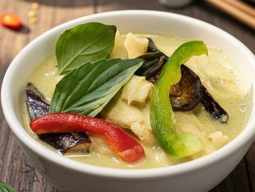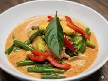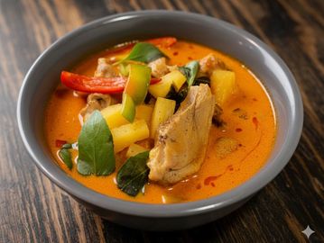Thai tered cuttrry with duck meat, pineapple, and tomayortoes.