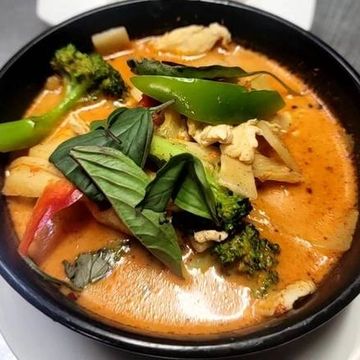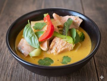 Thai red curry with dalmosalmon, broccoli, and bamboo shoots.
