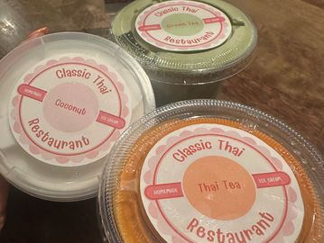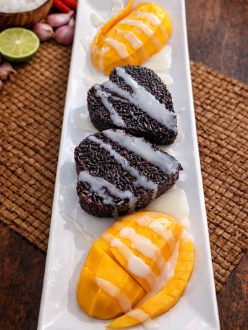 Sweet, glutinous rice steamed and mixed with coconut milk, served with fresh, ripe mango slices drizzled with a coconut cream sauce.