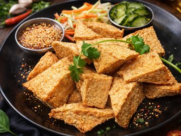 A crispy golden tofu served with a dipping sauce of ground peanuts and cucumber salad.