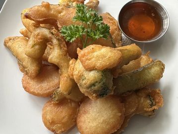 Battered and deep-fried of various vegetables served with a dipping sauce and cucumber salad.