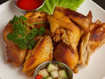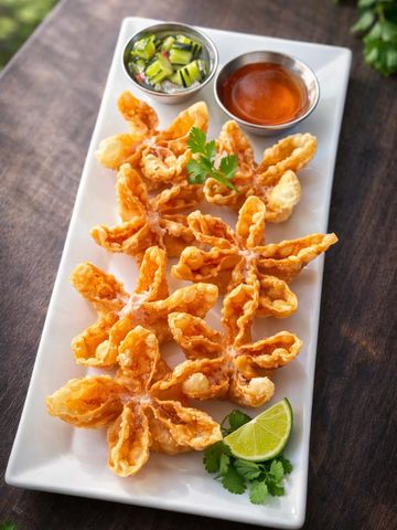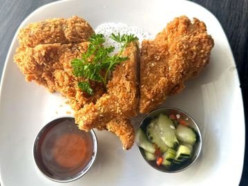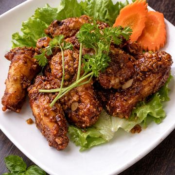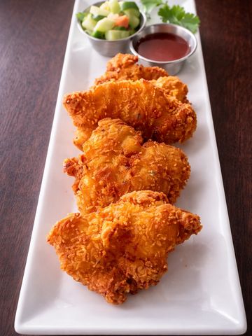 Battered and deep-fried chicken wings stuffed with ground chicken, glass noodles, and vegetables.