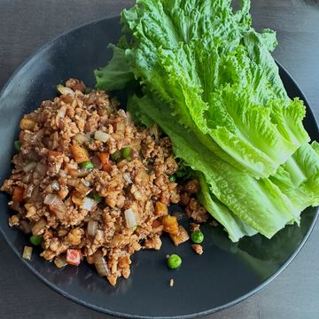 Ground chicken, water chestnuts, and vegetables cooked in a savory sauce served with fresh lettuce leaves.