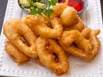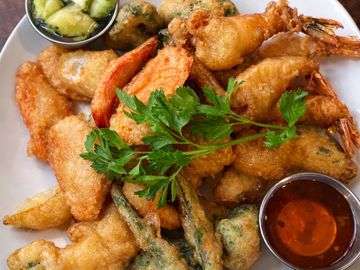 Battered and deep-fried shrimps and vegetables served with a dipping sauce and cucumber salad.