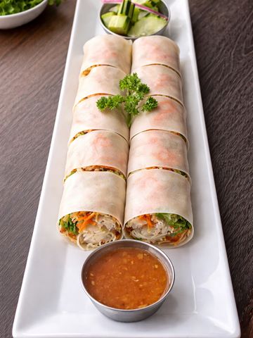 Tofu, egg, bean sprouts, cucumber, and carrot wrapped in a spring roll skin served with plum sauce and cucumber salad.