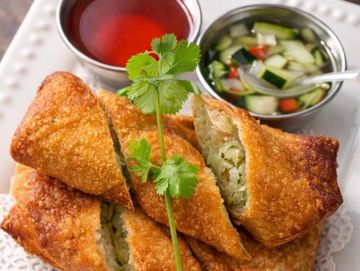 Deep-fried spring roll stuffed with glass noodles and vegetables.