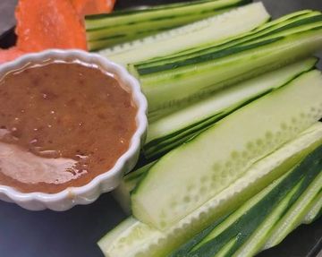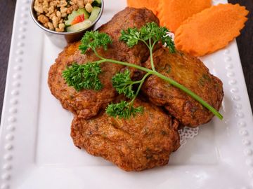 Deep-fried ground fish patties served with a dipping sauce of ground peanuts and cucumber.