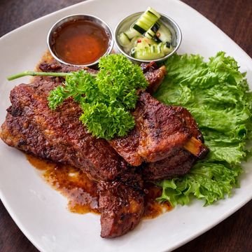 Slow-braised pork ribs with a tangy Asian BBQ sauce.