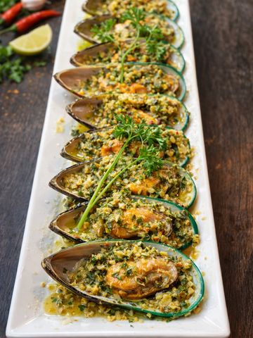 Baked mussels in garlic butter with pistachios. (can be substituted for shrimp or fish)
