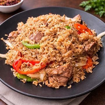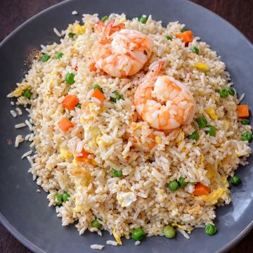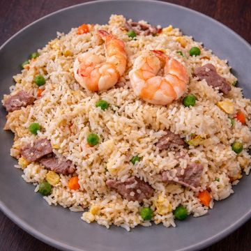 Fried rice with chicken, beef, pork, shrimp, egg peas, and carrots.