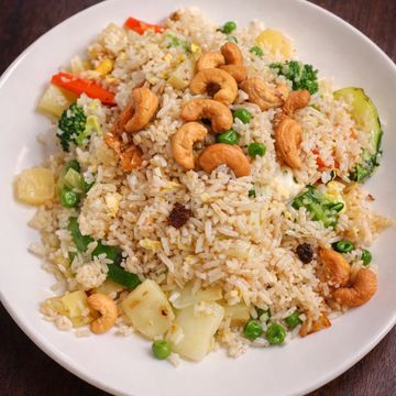Fried rice with egg, pineapple, peas, carrots, raisin and cashew nuts