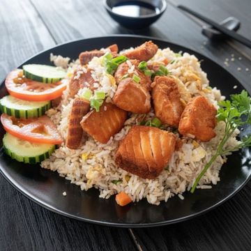 Fried rice with salmon, egg, peas, carrots, and chopped green oil