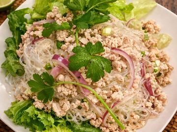 Glass noodles, ground chicken, and onion in lime dressing.