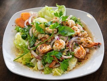 Grilled shrimp in lime dressing, onion, and mint leaves on fresh lettuce.