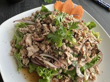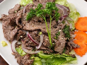 Grilled beef in lime dressing, onion, mint leaves, and roasted rice powder on fresh lettuce.