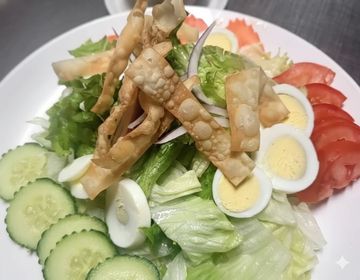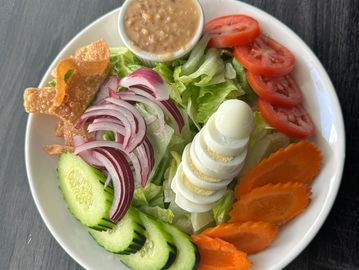 Lettuce, cucumber, onion, tomatoes, hard-boiled egg, and fried wonton skin served with peanut dreesing.