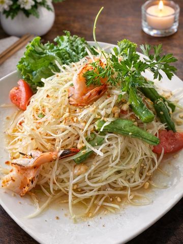 Shredded green papaya, tomatoes, green beans, and ground peanuts in lime dressing.