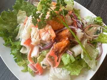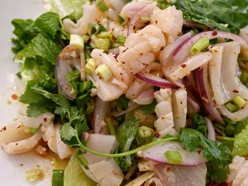 Squid in lime dressing, onion, and mint leaves on fresh lettuce.