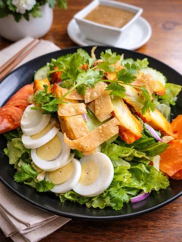 Lettuce, cucumber, onion, tomatoes, hard-boiled egg, fried wonton skin, and sliced marinate chicken served with peanut dressing.