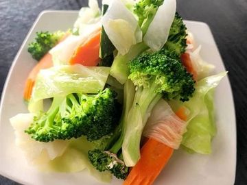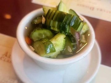 Sliced cucumbers, red onions, and bell peppers in a tangy vinegar.