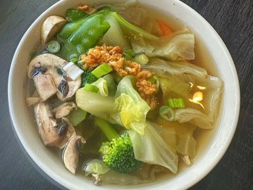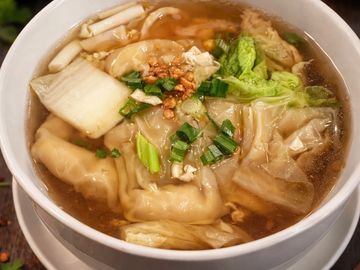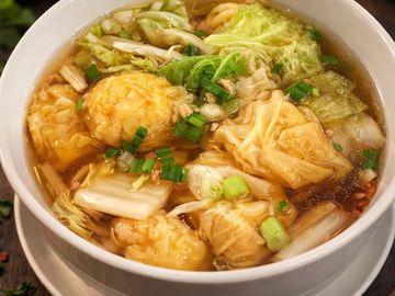 Chicken wonton, chicken, beef, shrimp in clear broth with mushrooms, and vegetables garnished with green onions.