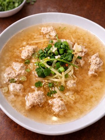 Ground chicken, ginger, rice, and chopped green onions in clear broth.