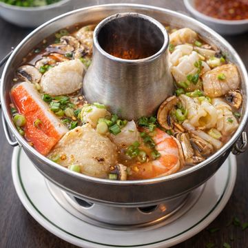Shrimp, squid, mussel, fish, imitation crab, mushrooms, lemongrass, and lime juice in coconut milk.