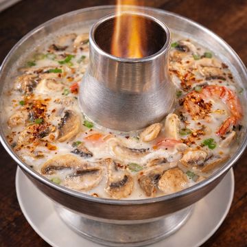 Shrimp, mushrooms, lemongrass, and lime juice in coconut milk.