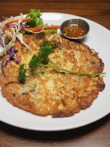 Thai-style omelette with ground meat, glass noodles, mushrooms, and green onions.